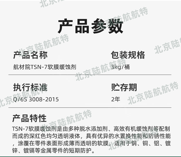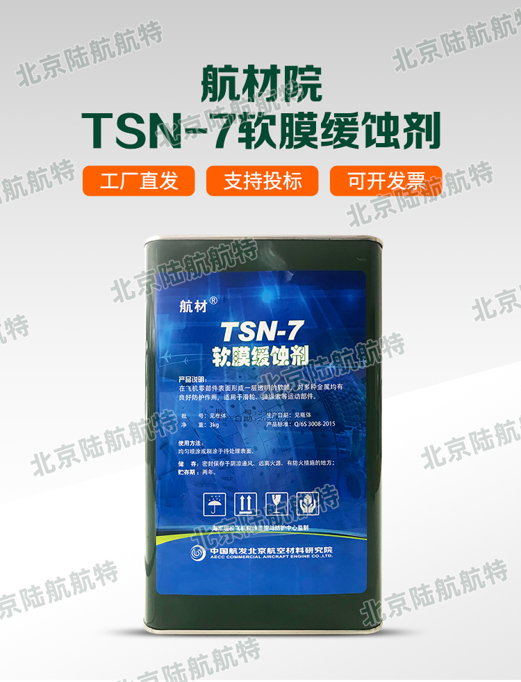 TSN-7软膜缓蚀剂由中国航发北京航空材料研究院(航材院)研制,是一种深红色均匀透明液体,由成膜剂、防锈剂、溶剂和助剂等组成。
