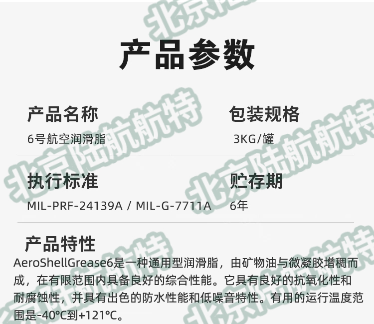 壳牌AeroShell Grease 6号航空润滑脂是一款通用型机身润滑脂,由壳牌石油公司出品,采用矿物油经微凝胶稠化制成,符合美军MIL-PRF-24139B规范。