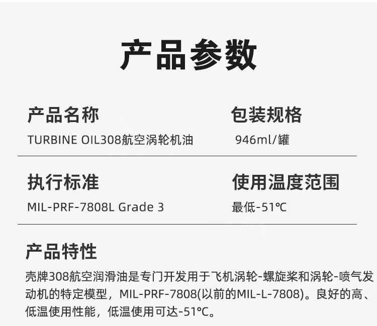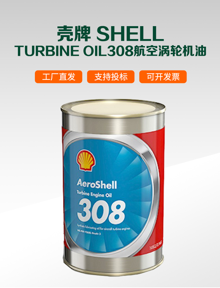 壳牌 Aeroshell Turbine Oil 308是一款符合美军标 MIL-PRF-7808L Grade 3 的低黏度合成酯基航空涡轮机油,主要用于涡轮喷气、涡轮螺旋桨及部分辅助动力装置。
