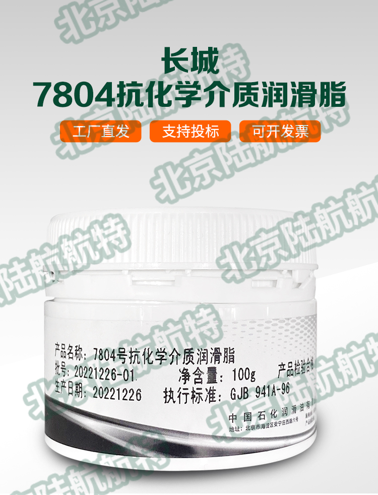 长城7804号抗化学介质润滑脂是一种氟类特种润滑剂,其基础油是全氟聚醚(PFPE)。7804号脂具备较好的化学惰性:不燃烧、耐辐射、耐强酸、耐强氧化剂,同时其还具备良好的材料适应能力。目前该脂在航天领域已经应用多年,性能好、稳定。