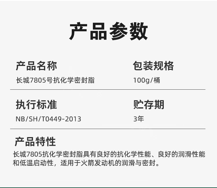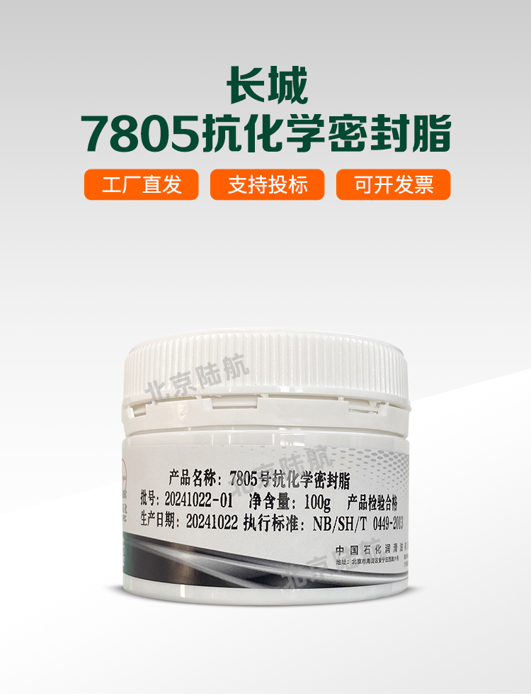 长城7805号抗化学介质密封脂是一种氟类特种润滑剂,其基础油是全氟聚醚(PFPE)。7805号脂具备良好的化学惰性:不燃烧、耐辐射、耐强酸、耐强氧化剂,同时其还具备较好的材料适应能力。目前该脂在航天领域已经应用多年,性能较好、稳定。