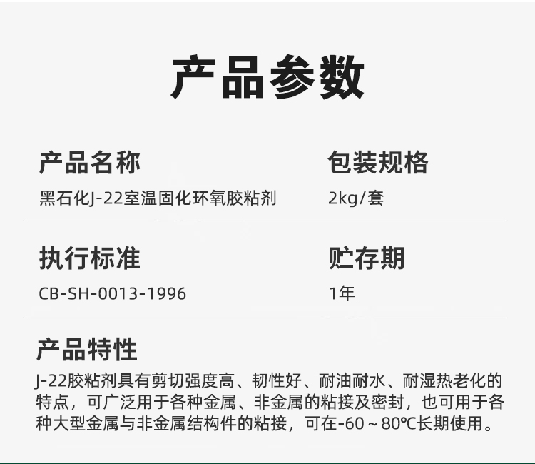 J-22胶粘剂具有剪切强度高、韧性好、耐油、耐水、耐湿热老化性能好的特点,可广泛用于各种金属、非金属的粘接及密封,也可用于各种大型金属与非金属结构件的粘接,该胶可在-60~80℃长期使用。